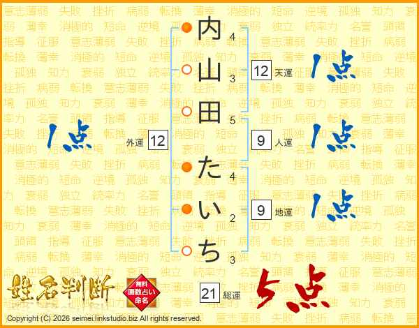 内(4画)山(3画)田(5画) た(4画)い(2画)ち(3画)