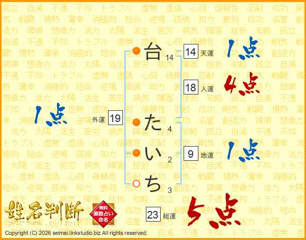 生活面を象徴する運勢です。外部から受ける影響力を表し、結婚運、家庭運や職場、環境への順応性を表します。総運から人運を引いた画数。姓や名が1文字の場合を除く。
