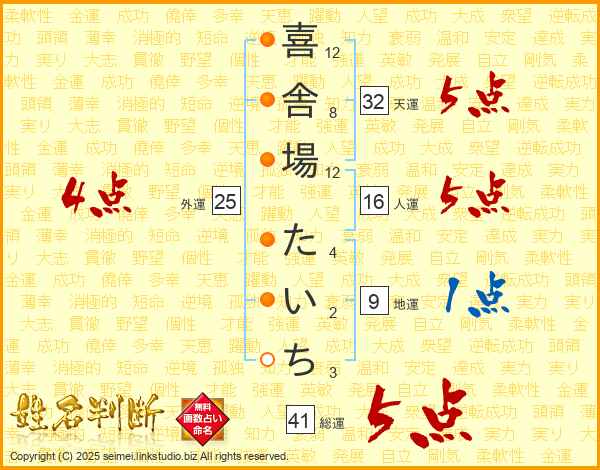 喜(12画)舎(8画)場(12画) た(4画)い(2画)ち(3画)