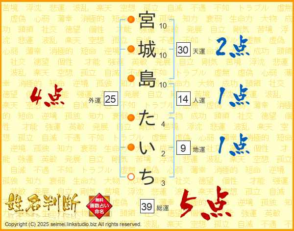宮城島たいちさんの総運は39画の5点!