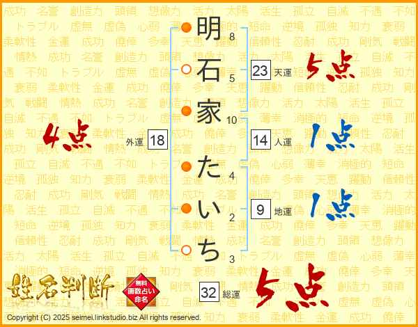 明石家たいちさんの総運は32画の5点!