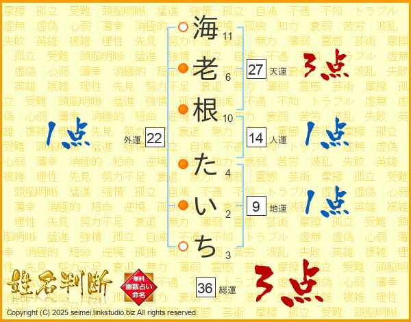 海(11画)老(6画)根(10画) た(4画)い(2画)ち(3画)