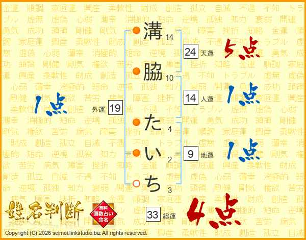 生活面を象徴する運勢です。外部から受ける影響力を表し、結婚運、家庭運や職場、環境への順応性を表します。総運から人運を引いた画数。姓や名が1文字の場合を除く。