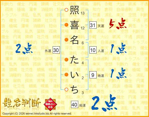 照(13画)喜(12画)名(6画) た(4画)い(2画)ち(3画)
