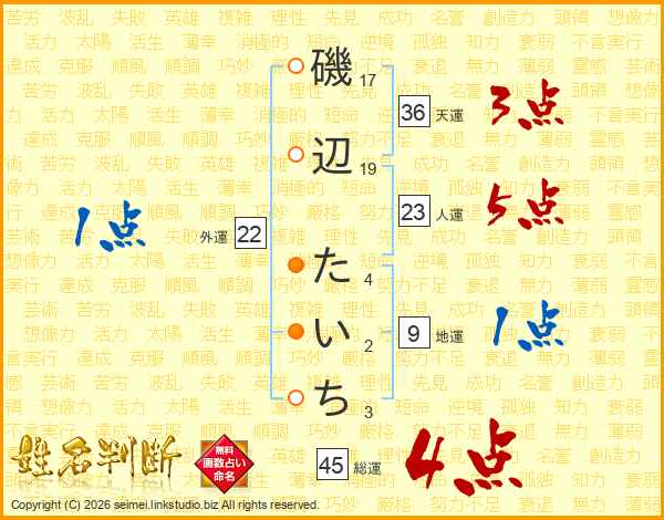 磯(17画)辺(19画) た(4画)い(2画)ち(3画)