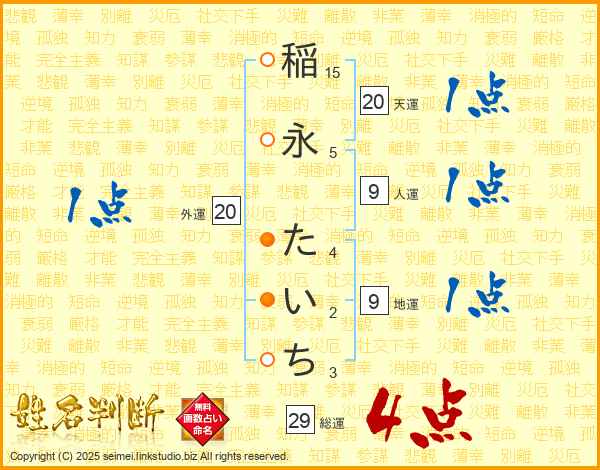 稲(15画)永(5画) た(4画)い(2画)ち(3画)
