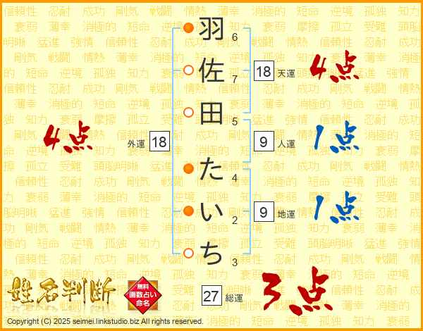羽(6画)佐(7画)田(5画) た(4画)い(2画)ち(3画)