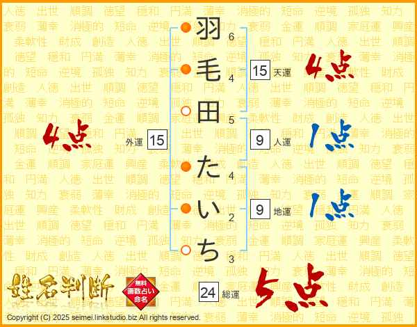 生活面を象徴する運勢です。外部から受ける影響力を表し、結婚運、家庭運や職場、環境への順応性を表します。総運から人運を引いた画数。姓や名が1文字の場合を除く。