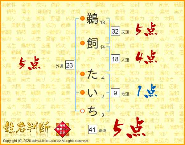 鵜飼たいちさんの総運は41画の5点!