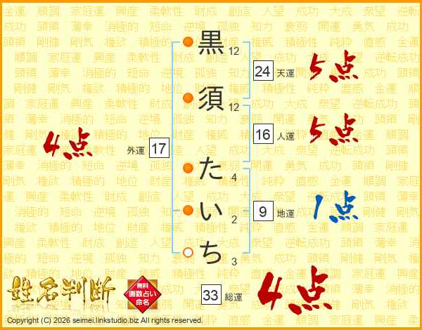 黒須たいちさんの総運は33画の4点!