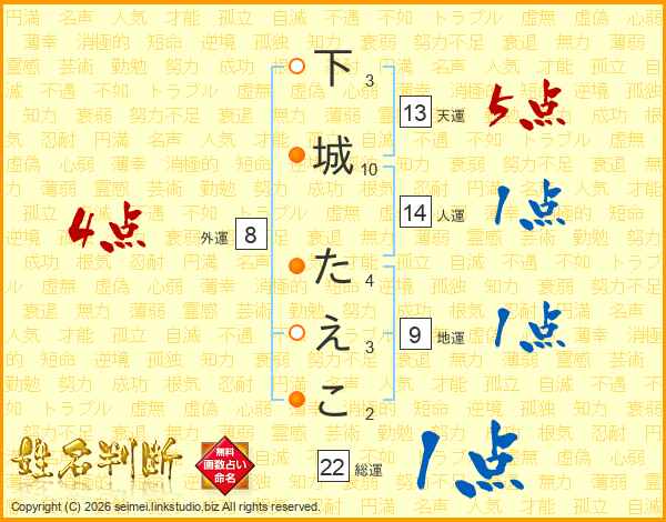 下城たえこさんの総運は22画の1点!