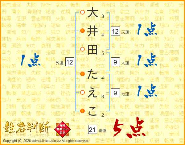 生活面を象徴する運勢です。外部から受ける影響力を表し、結婚運、家庭運や職場、環境への順応性を表します。総運から人運を引いた画数。姓や名が1文字の場合を除く。