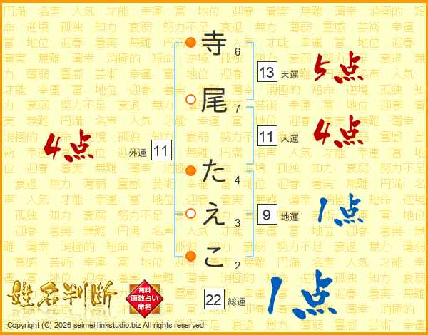 生活面を象徴する運勢です。外部から受ける影響力を表し、結婚運、家庭運や職場、環境への順応性を表します。総運から人運を引いた画数。姓や名が1文字の場合を除く。