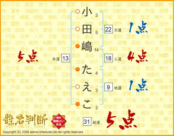 小田嶋たえこさんの総運は31画の5点!