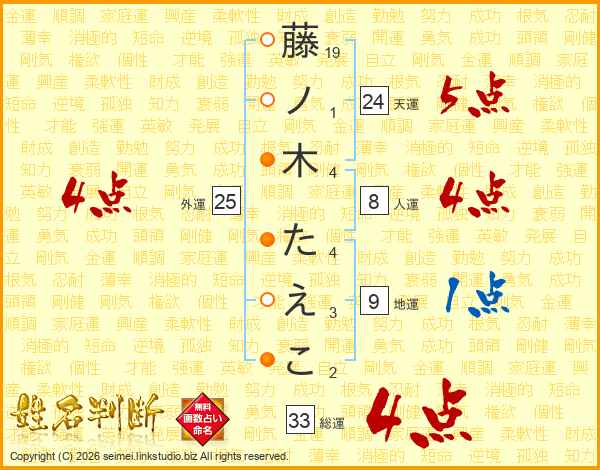 藤ノ木たえこさんの総運は33画の4点!