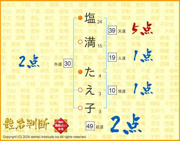 塩(24画)満(15画) た(4画)え(3画)子(3画)