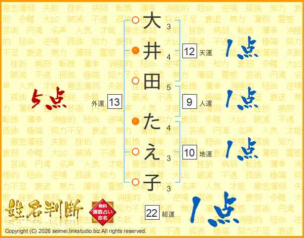 大井田たえ子さんの外運は13画の5点!