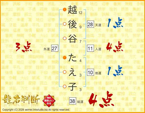 越後谷たえ子さんの総運は38画の4点!