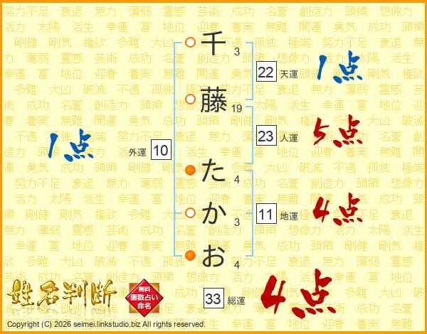 千藤たかおさんの総運は33画の4点!