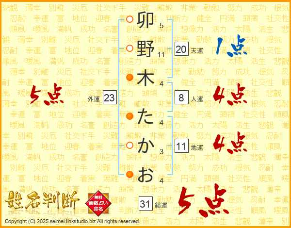 あなたの人生を表す1番重要な運勢です。生涯を通じて影響する総合運となり、主に50歳以降の晩年期に影響を及ぼします。苗字と名前の合計画数。