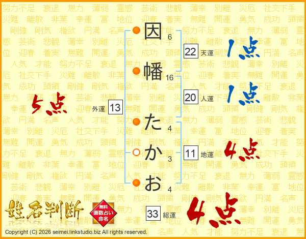 因(6画)幡(16画) た(4画)か(3画)お(4画)