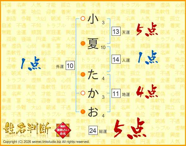 生活面を象徴する運勢です。外部から受ける影響力を表し、結婚運、家庭運や職場、環境への順応性を表します。総運から人運を引いた画数。姓や名が1文字の場合を除く。