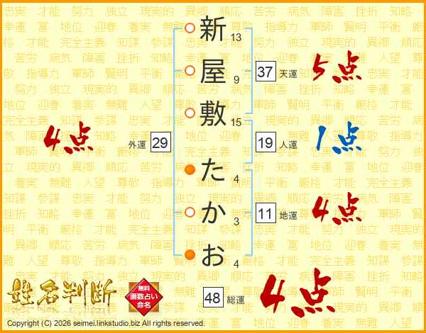 新(13画)屋(9画)敷(15画) た(4画)か(3画)お(4画)