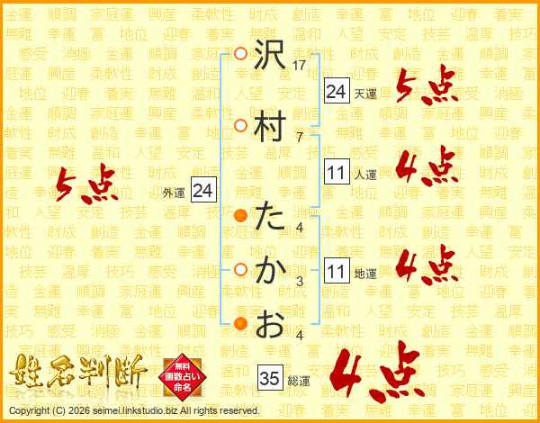 沢村たかおさんの総運は35画の4点!