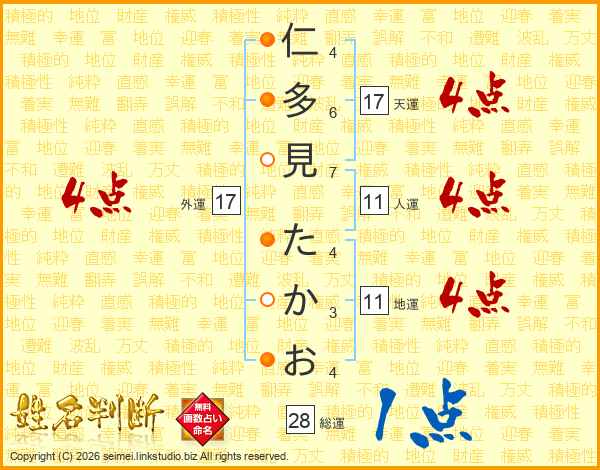 仁(4画)多(6画)見(7画) た(4画)か(3画)お(4画)