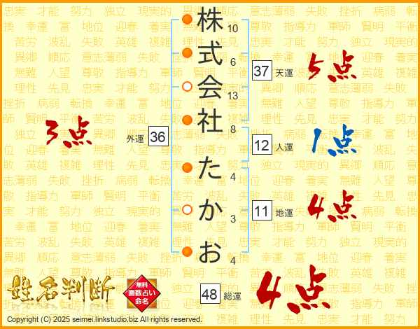株(10画)式(6画)会(13画)社(8画) た(4画)か(3画)お(4画)