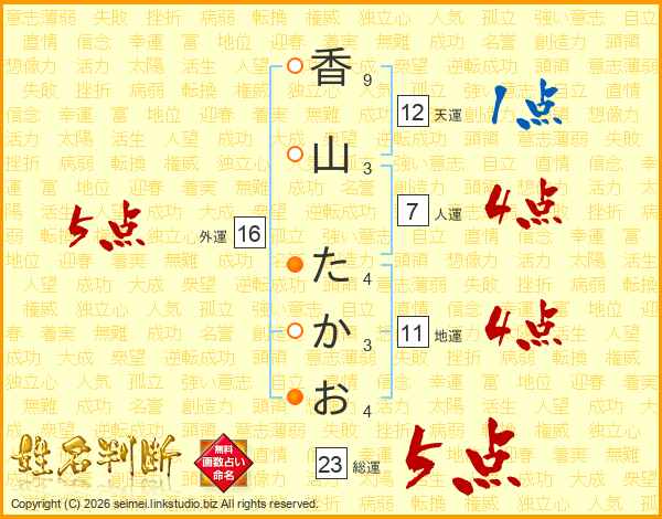 香(9画)山(3画) た(4画)か(3画)お(4画)