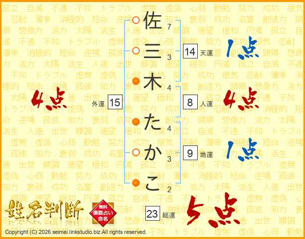 佐三木たかこさんの総運は23画の5点!