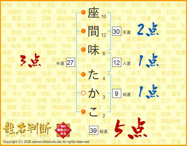 座間味たかこさんの総運は39画の5点!