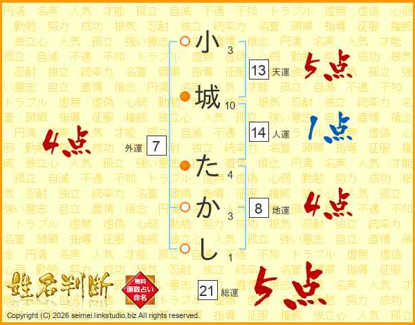 小城たかしさんの総運は21画の5点!