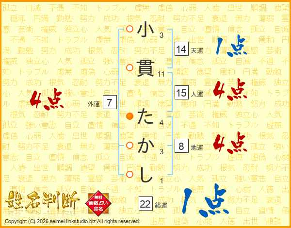 小(3画)貫(11画) た(4画)か(3画)し(1画)