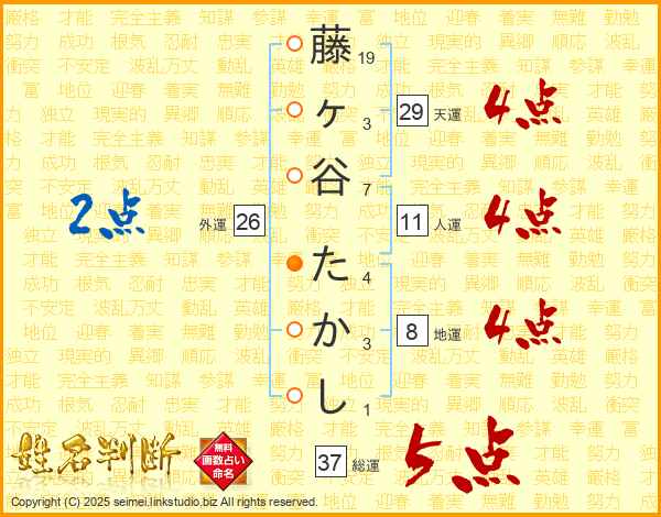 藤(19画)ヶ(3画)谷(7画) た(4画)か(3画)し(1画)