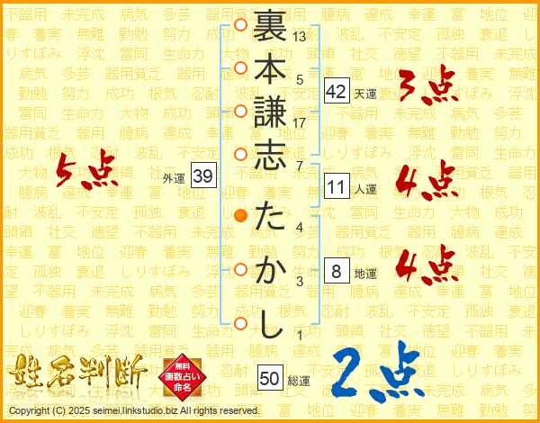 裏(13画)本(5画)謙(17画)志(7画) た(4画)か(3画)し(1画)