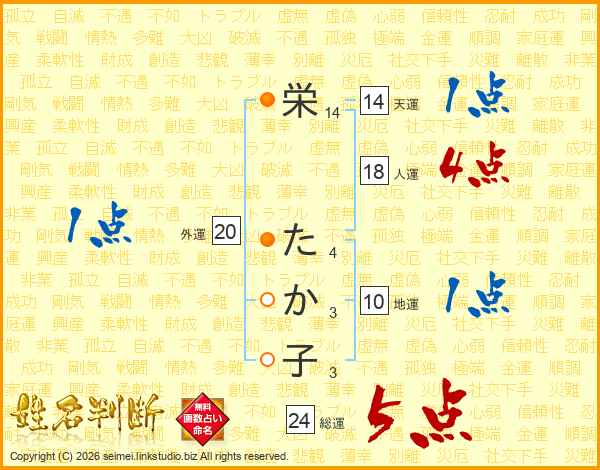生活面を象徴する運勢です。外部から受ける影響力を表し、結婚運、家庭運や職場、環境への順応性を表します。総運から人運を引いた画数。姓や名が1文字の場合を除く。