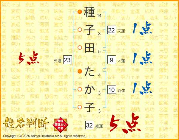 種(14画)子(3画)田(5画) た(4画)か(3画)子(3画)