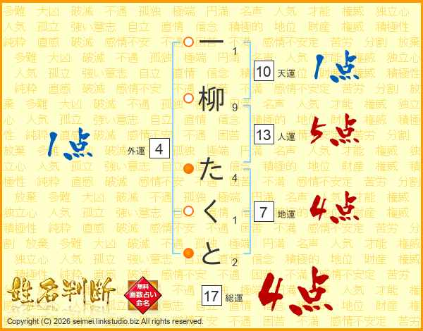 一柳たくとさんの人運は13画の5点!
