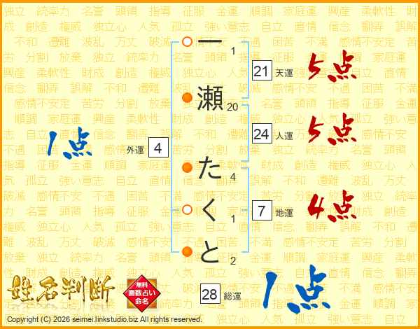 一瀬たくとさんの天運は21画の5点!
