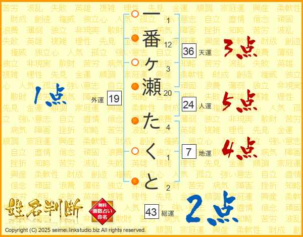 一番ヶ瀬たくとさんの人運は24画の5点!