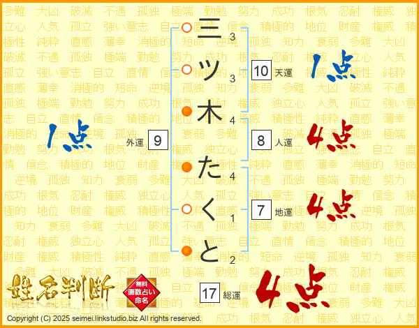三ツ木たくとさんの総運は17画の4点!