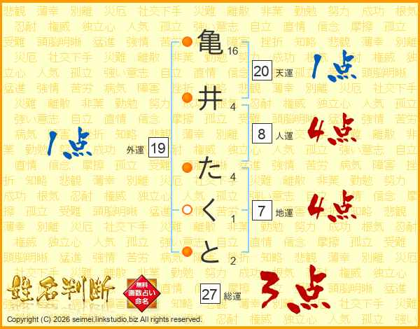 亀(16画)井(4画) た(4画)く(1画)と(2画)