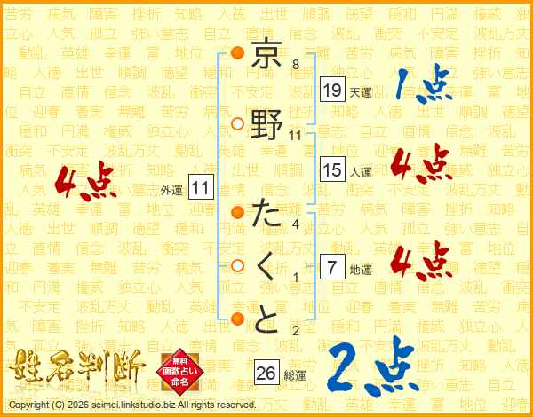京野たくとさんの総運は26画の2点!