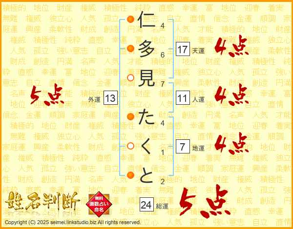 仁(4画)多(6画)見(7画) た(4画)く(1画)と(2画)