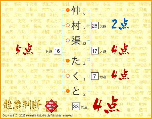 仲(6画)村(7画)渠(13画) た(4画)く(1画)と(2画)
