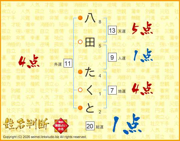 生活面を象徴する運勢です。外部から受ける影響力を表し、結婚運、家庭運や職場、環境への順応性を表します。総運から人運を引いた画数。姓や名が1文字の場合を除く。