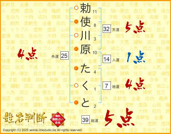 生活面を象徴する運勢です。外部から受ける影響力を表し、結婚運、家庭運や職場、環境への順応性を表します。総運から人運を引いた画数。姓や名が1文字の場合を除く。