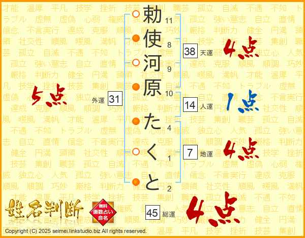 生活面を象徴する運勢です。外部から受ける影響力を表し、結婚運、家庭運や職場、環境への順応性を表します。総運から人運を引いた画数。姓や名が1文字の場合を除く。
